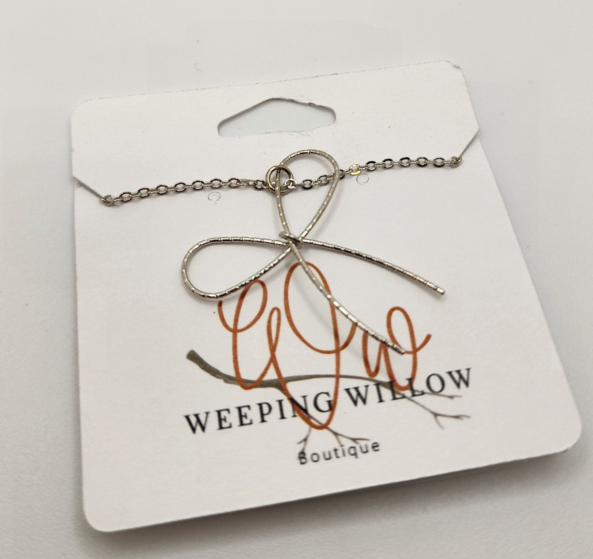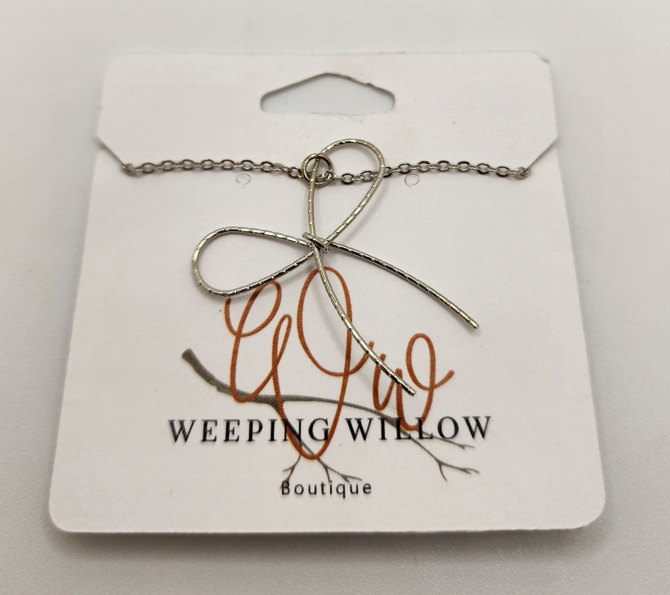 Delicate silver bow necklace that adds a touch of elegance to any outfit. This timeless piece features a polished finish and adjustable chain, making it comfortable for everyday wear or special occasions. Perfect for layering or wearing solo, it's a versatile accessory that complements both casual and dressy styles.