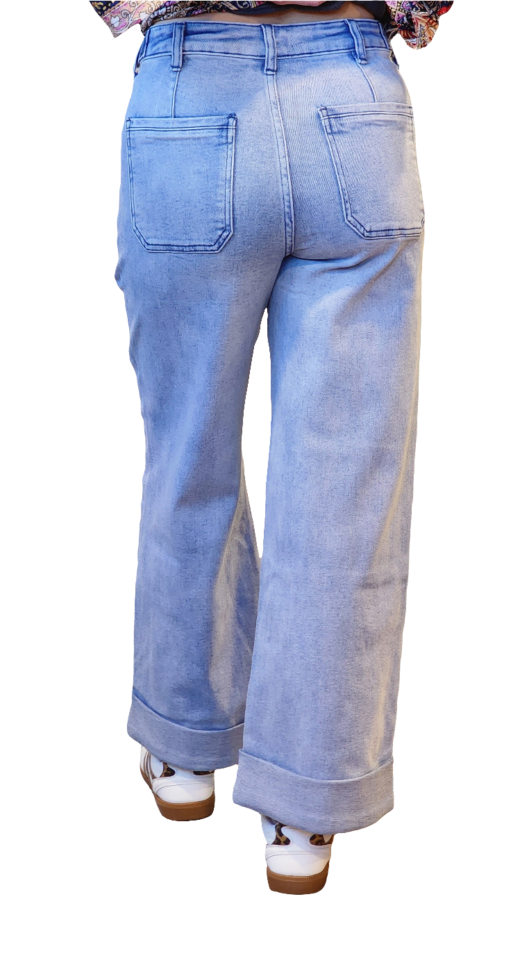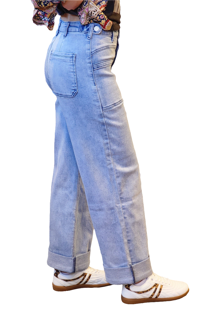 The BEST new trendiest jeans we have come out with! SO SO stretchy, comfy and soft! Features front pockets and decorative waist buttons. Waist is stretchy also! Inseam listed on the size chart is total length (unrolled). Comes rolled at the bottom and steamed to stay rolled, but can be unrolled- not stitched.