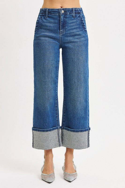 Meet your new denim obsession—high-rise crop jeans that refuse to blend in. The relaxed wide-leg fit gives you room to move and groove, while those rhinestone-studded cuffs? Pure magic. They catch the light, catch compliments, and catch everyone's attention. Dress them down with kicks or dress them up with heels.