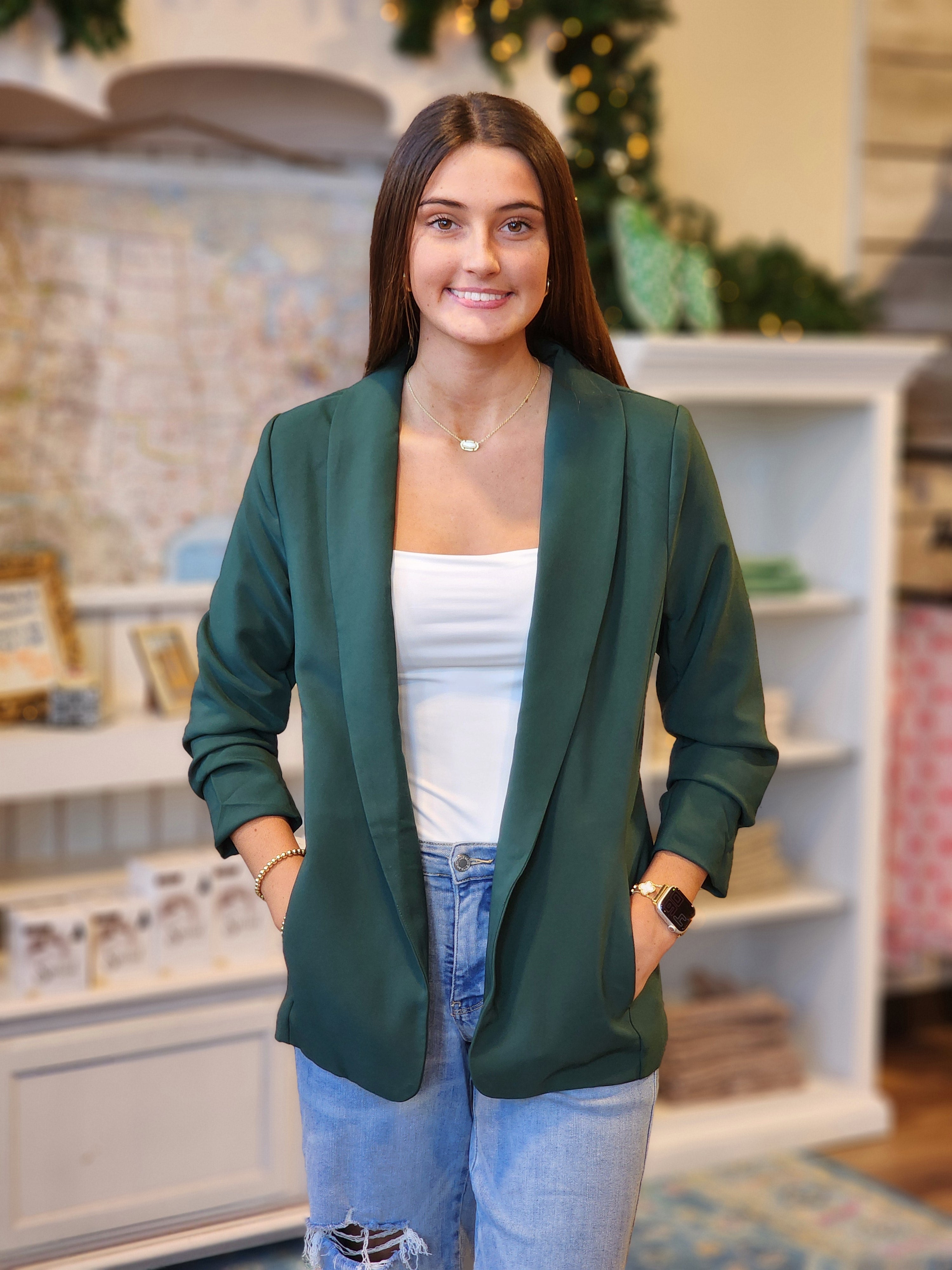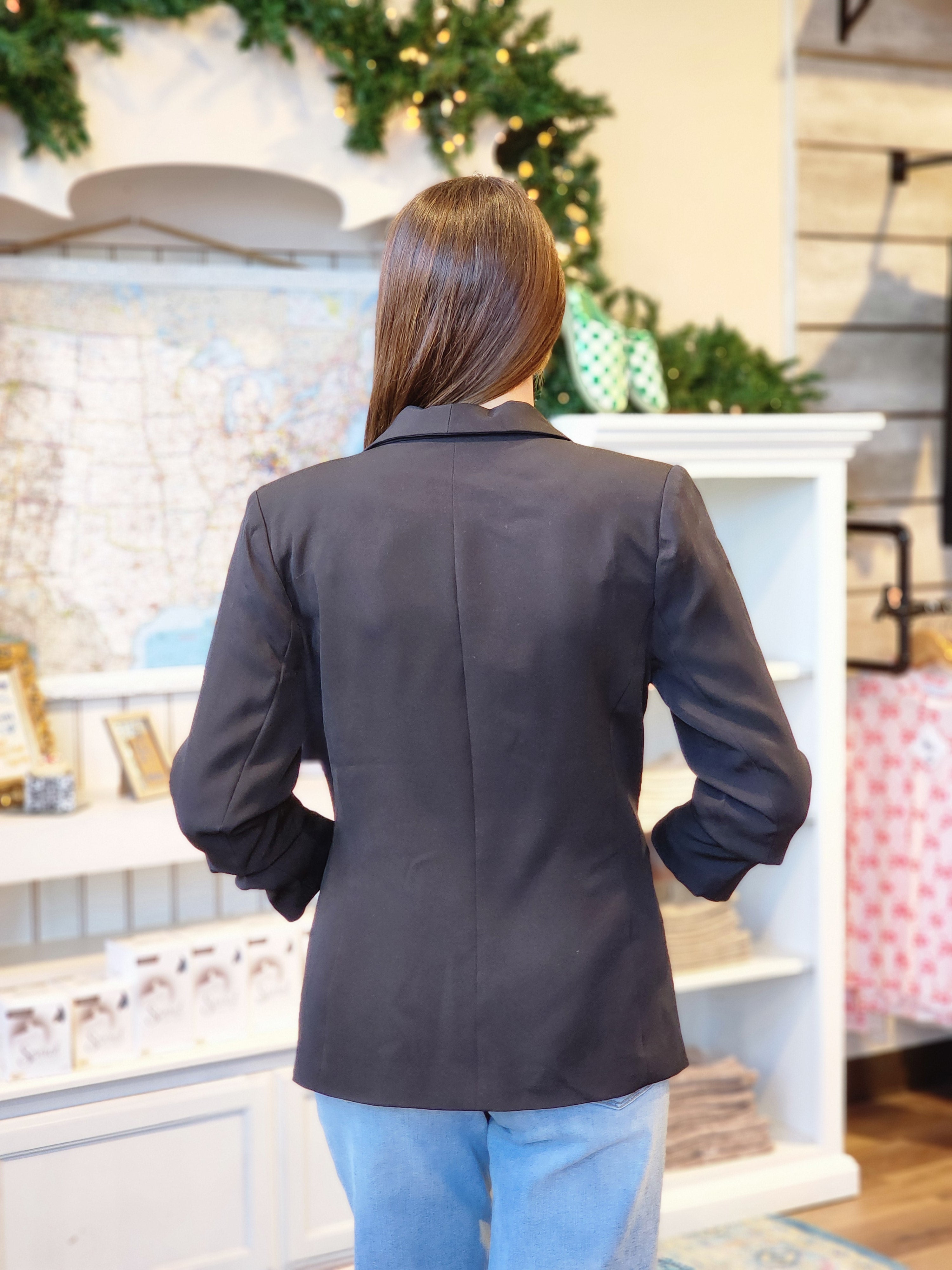 Unleash your inner boss babe with our WOVEN RUCHED SLEEVE BLAZER! This classic blazer features 3/4 ruched sleeves and shoulder pads for a playful, yet powerful look. Whether you're heading to the office or a night out, this lined blazer will elevate your style game.