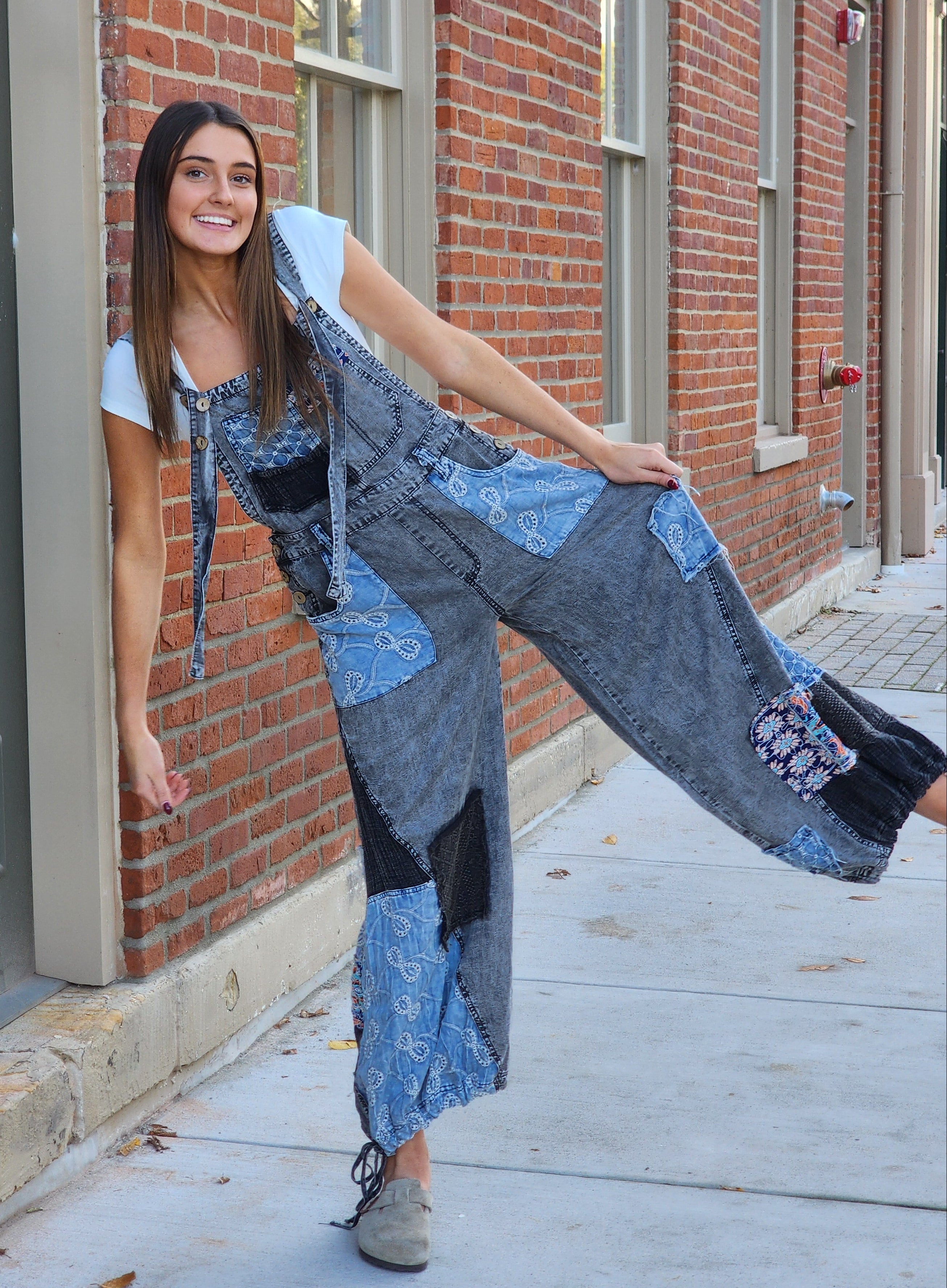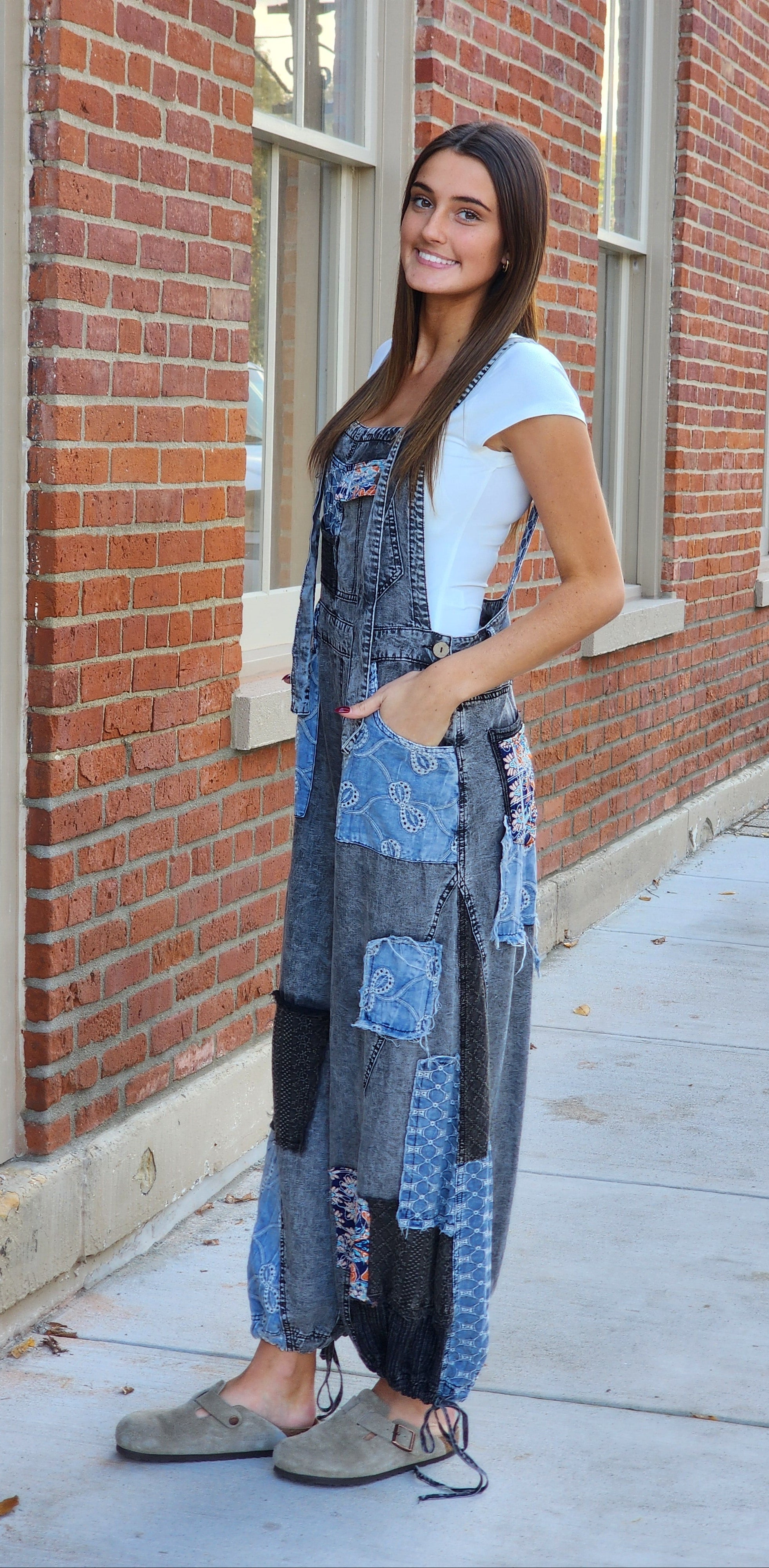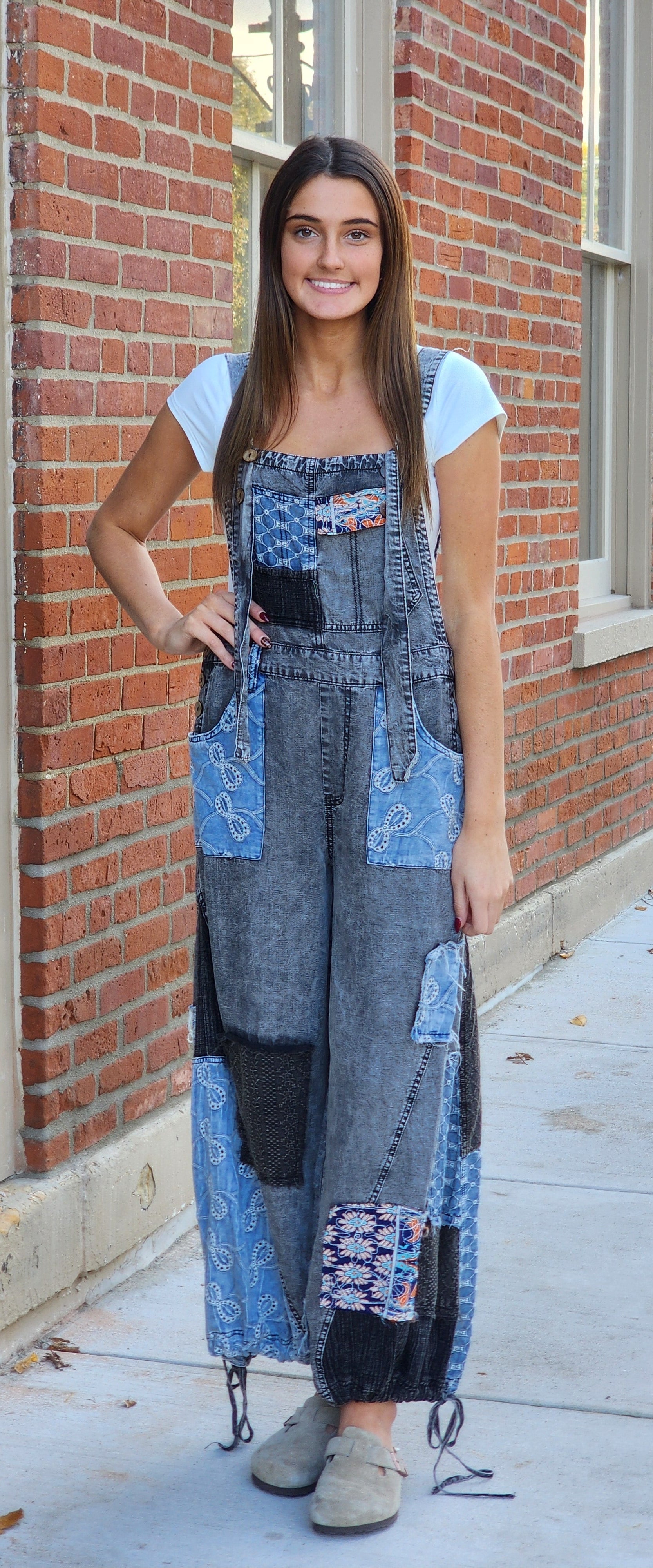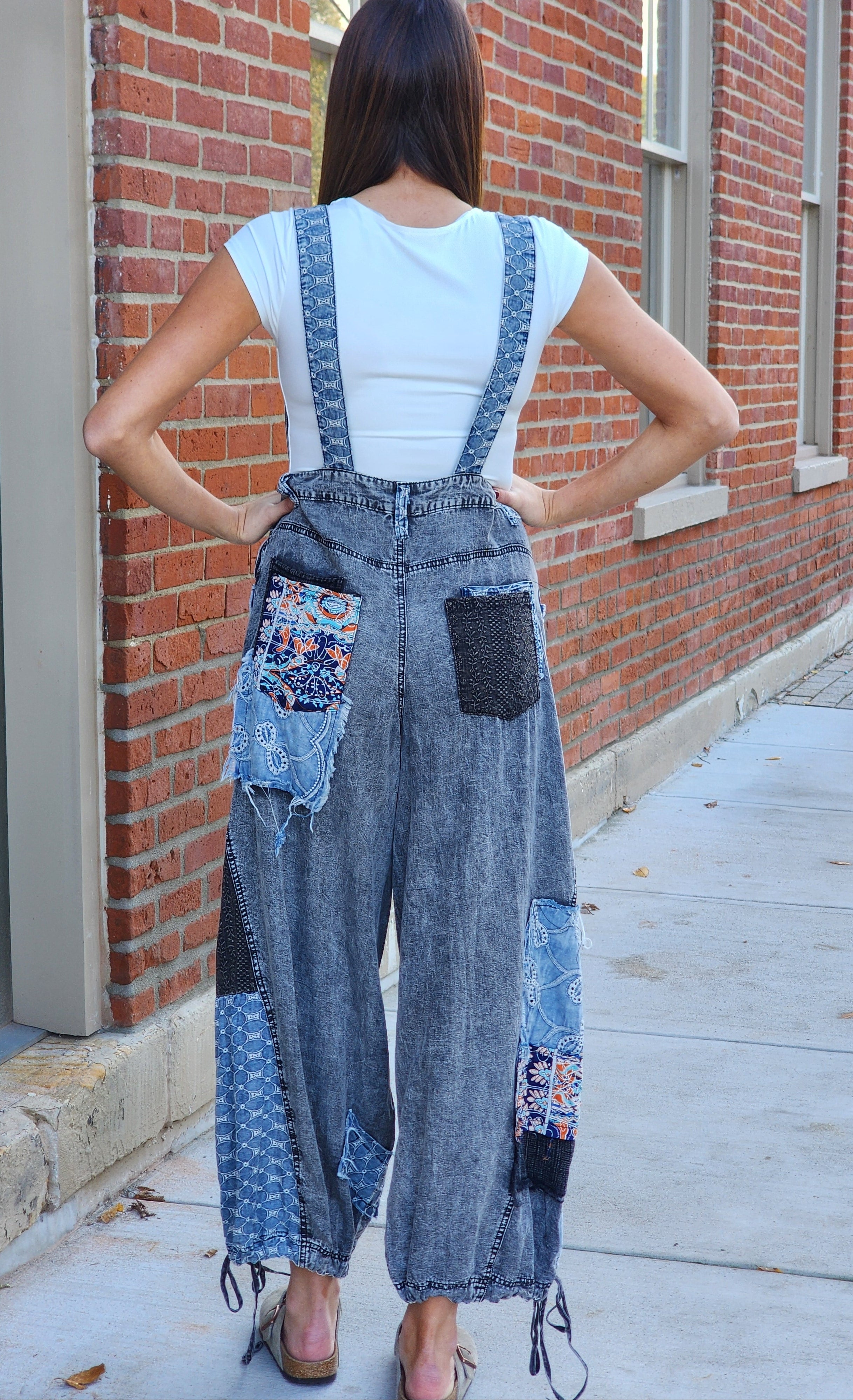 Oversized denim overalls with a relaxed, baggy silhouette designed for effortless comfort. Three-button straps allow you to dial in the perfect length, while adjustable ankle ties give you control over the leg opening. The multi-patch detailing adds visual interest and character to this wardrobe staple. Built from sturdy denim that holds up to regular wear, these overalls work as hard as you do—whether you're running errands or making a statement.