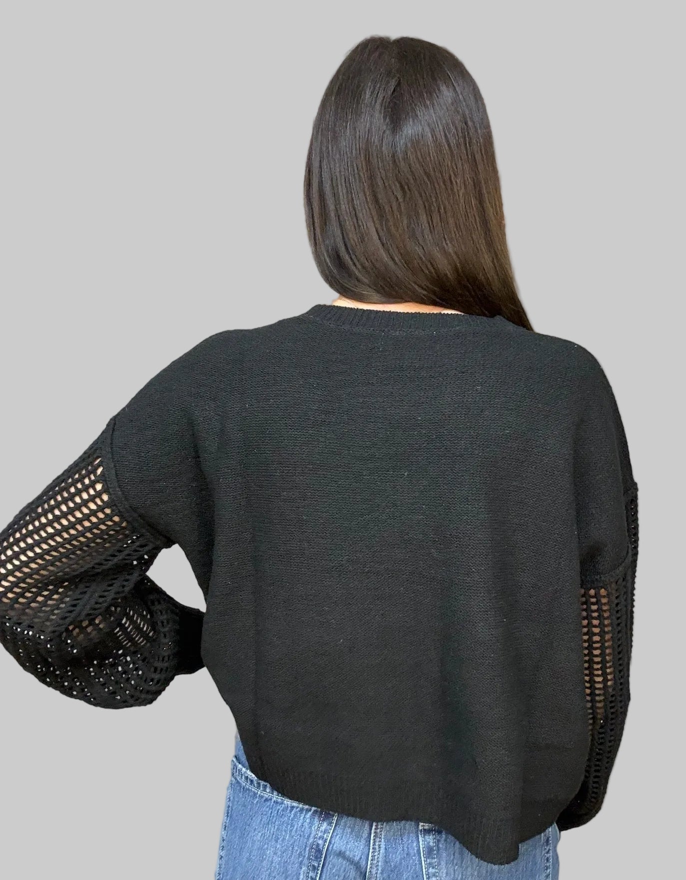 Solid long sleeve sweater top featuring a ribbed V-neckline, one front chest pocket with open knit detailing, a ribbed bottom band, open knit sleeves with ribbed cuffs and is a slight cropped length.