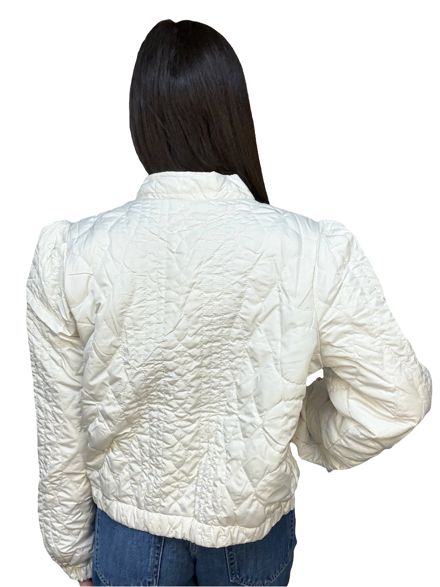 Quilted pattern long sleeve jacket featuring a button-down front, elastic cuffs, an elastic bottom band, two side hip pockets and is a cropped length.