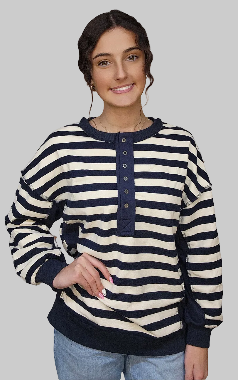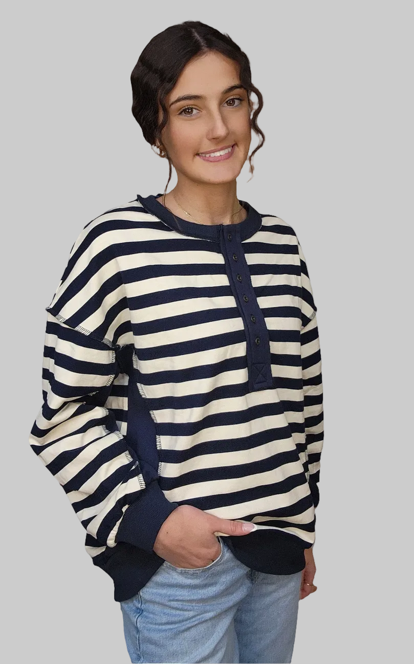 Oversized striped knit top with drop shoulders and round neckline. Long sleeves feature raw edge detailing for an effortless, lived-in look. Half button-down front allows for easy layering and styling versatility. Perfect for casual everyday wear.