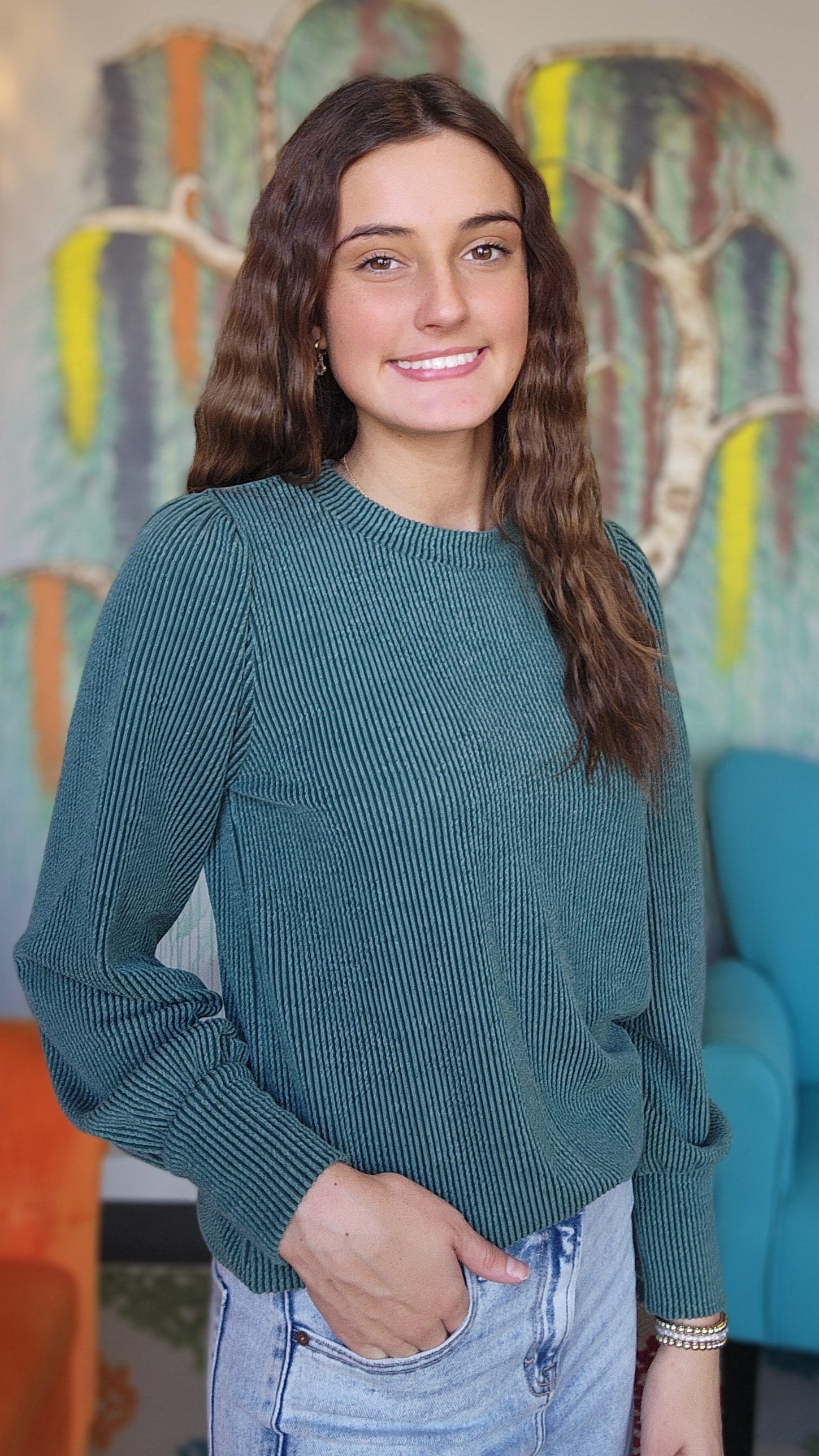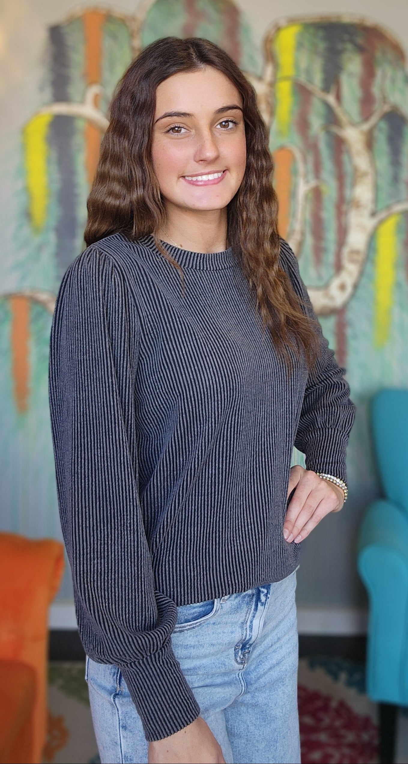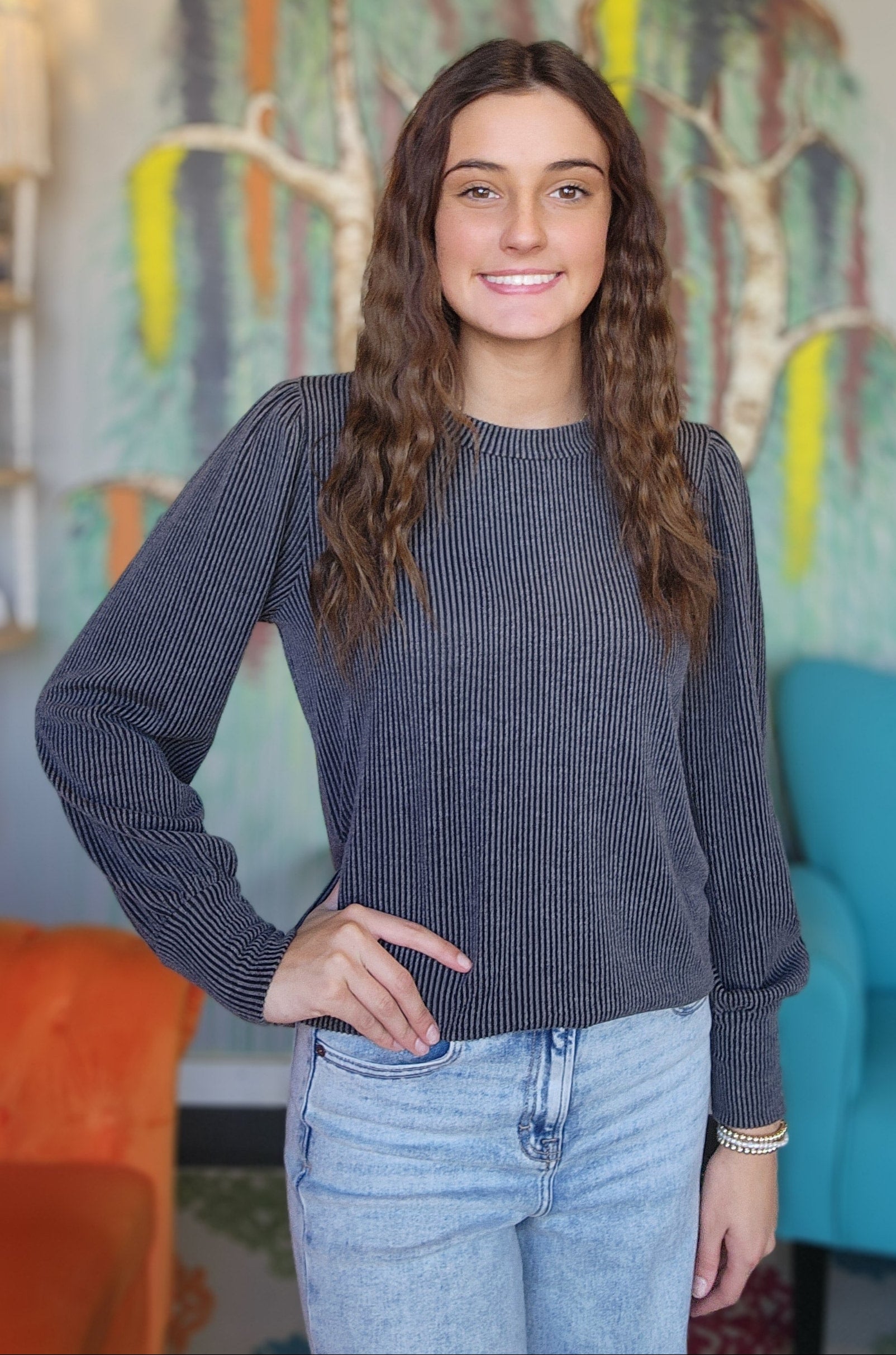 This long-sleeve rib knit top features a round neck and a ruffle detail for added style. Made with jacquard textured fabric and mineral washed for a soft, lived-in feel, it offers comfortable wear with a subtle unique pattern. Perfect for layering or wearing on its own for a casual, polished look.