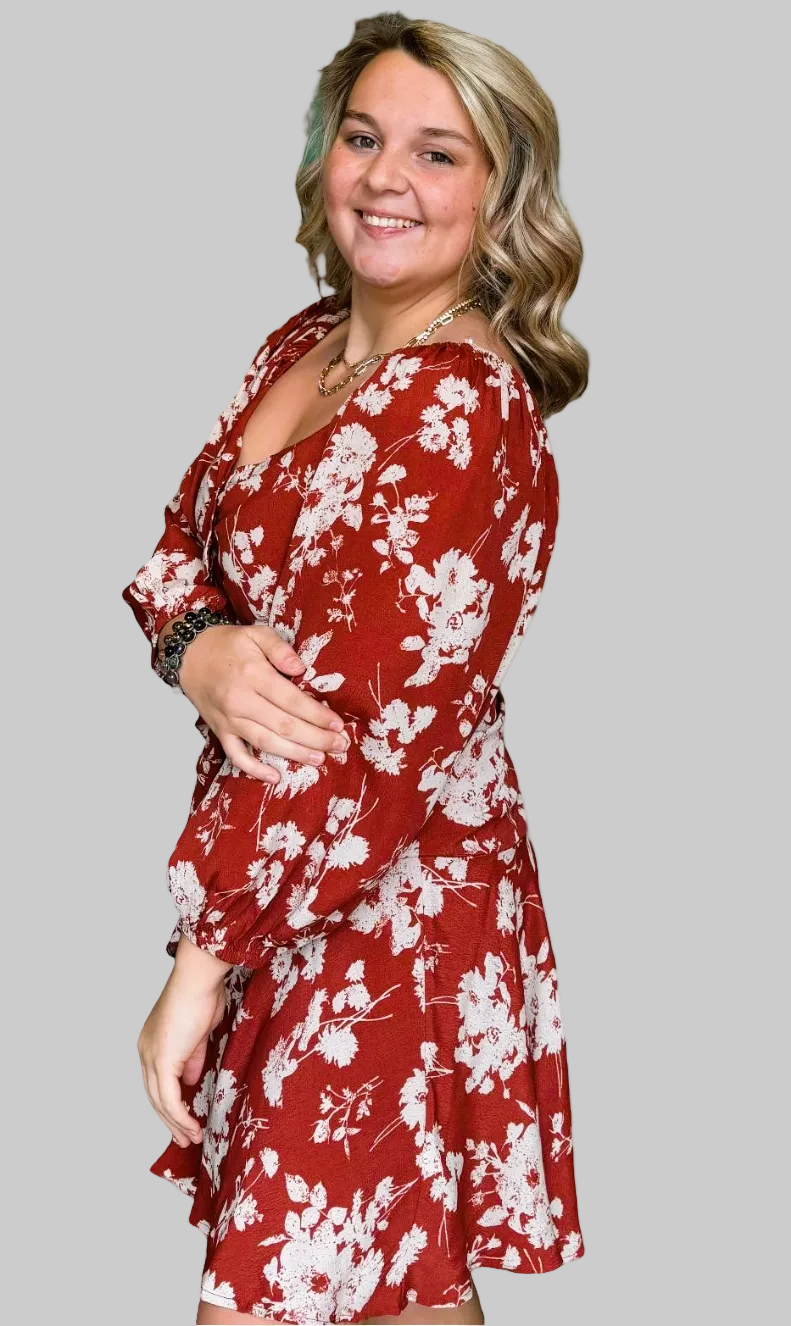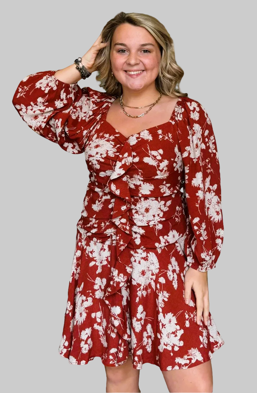 Add a touch of sweetness to your wardrobe with our Sweetheart Neckline dress. Featuring playful bubble sleeves and a beautifully ruched bodice, this dress in a crimson floral print will surely make a statement. Perfect for any occasion, this dress will have you looking effortlessly stylish. LINED