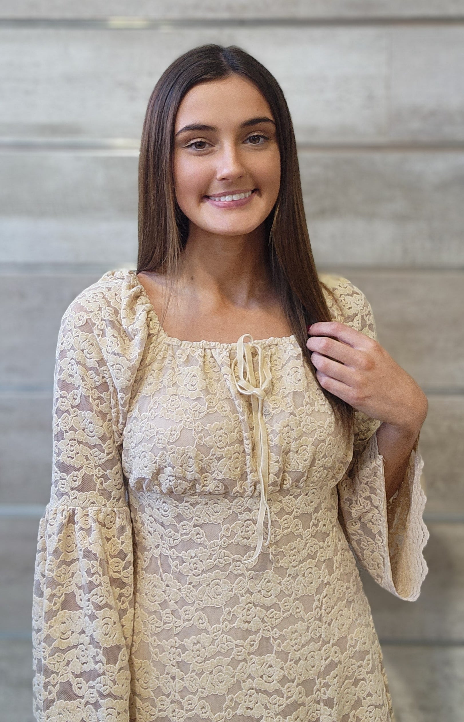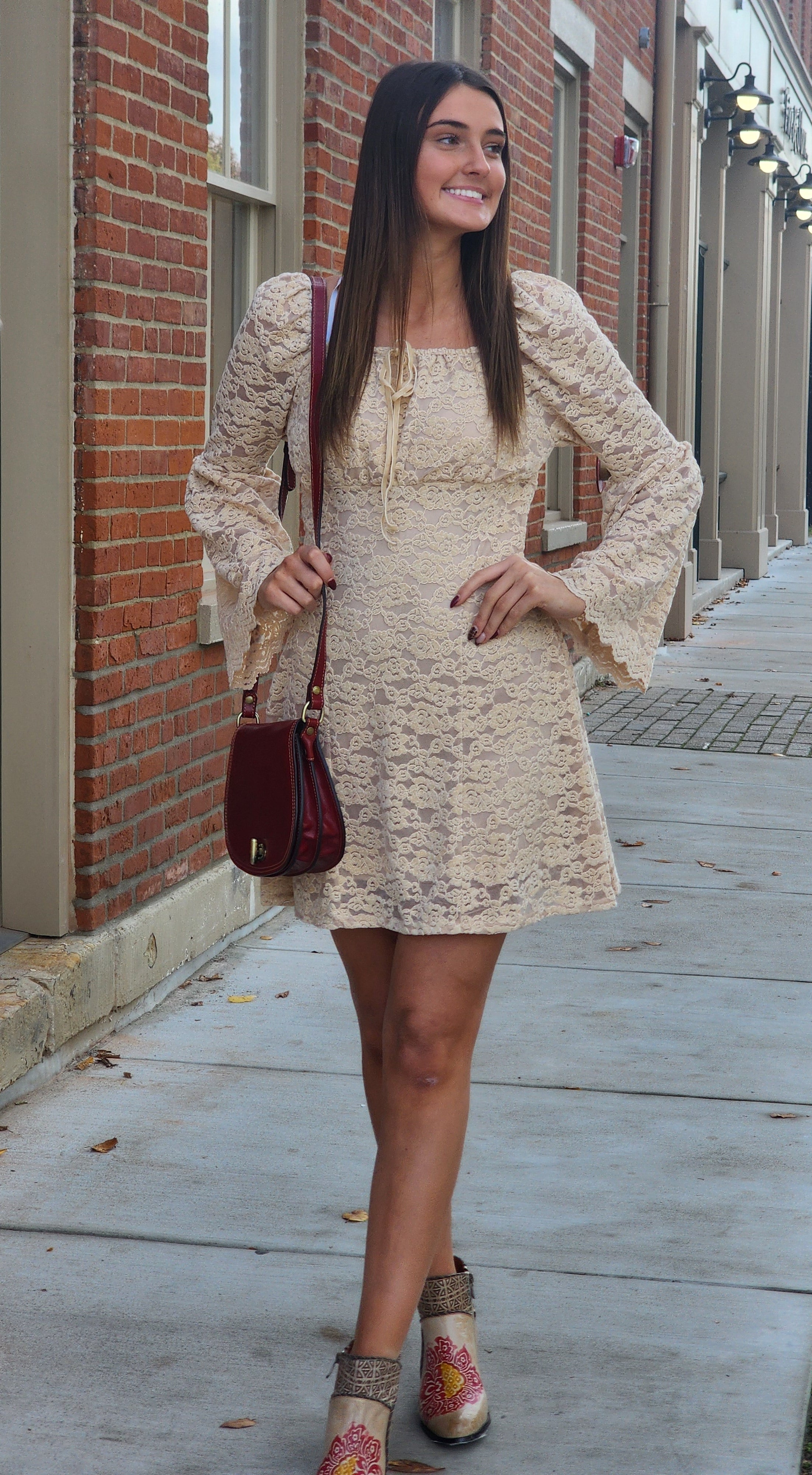 This textured lace mini dress strikes the perfect balance between feminine and sophisticated. The square neckline offers a modern take on classic elegance, while flowing bell sleeves create an effortlessly graceful look. A delicate front bow adds just the right amount of charm without overwhelming the design. Built with quality lace and a comfortable internal lining, this dress moves with you throughout your day or night out.