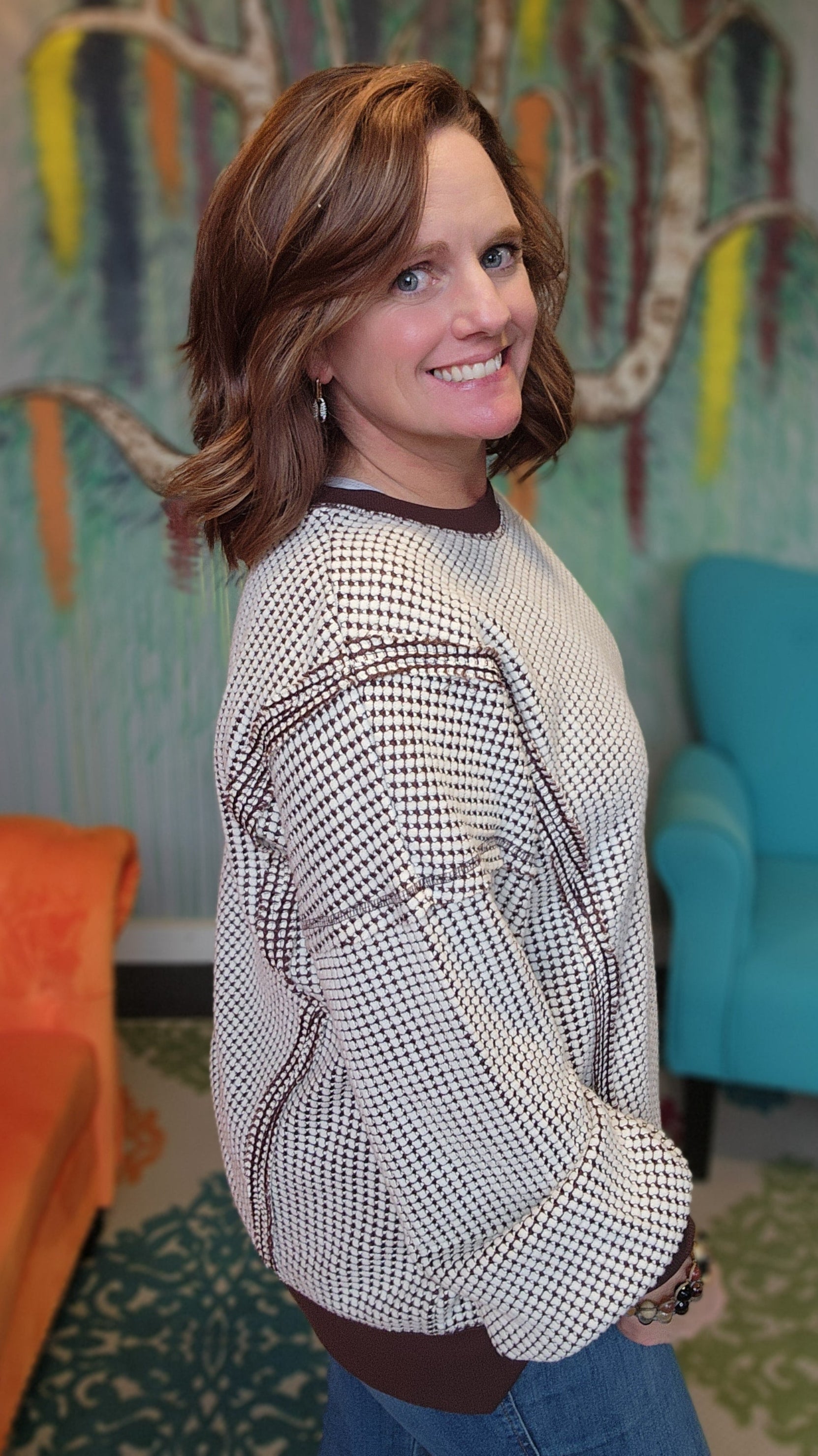 This oversized waffle knit top offers a relaxed fit with drop shoulders for easy movement and comfort. Featuring a classic round neck and long sleeves, it’s perfect for layering or wearing on its own. The front slit adds a subtle touch of style while enhancing breathability. Ideal for casual days, this top combines cozy texture with effortless design.