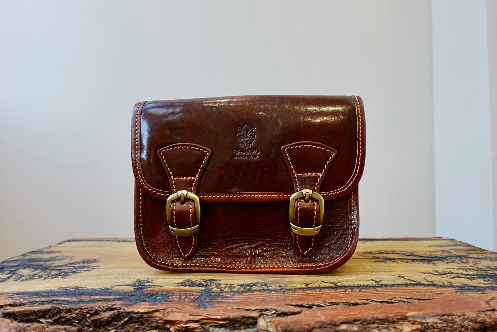 Crafted from genuine vegetable-tanned cow hide, this compact crossbody bag combines timeless leather quality with practical functionality. The double mini buckle closure pairs with a magnetic snap for secure fastening, while an adjustable leather strap lets you customize the fit. Inside, you'll find a zippered pocket and dual compartments to keep essentials organized. Perfect for everyday carry with authentic, durable style.