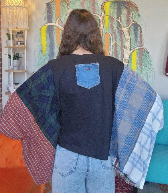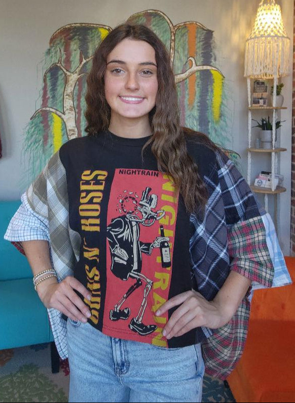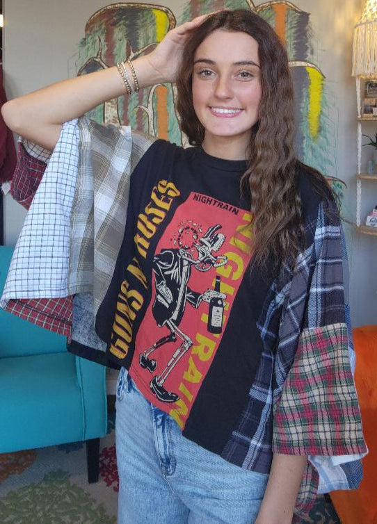 These pieces have been made using upcycled Rock band tees, each piece is one-of-a-kind and designed combining deconstructed vintage denim and upcycled band tees. This diverts it from the landfills and gives it new life.
