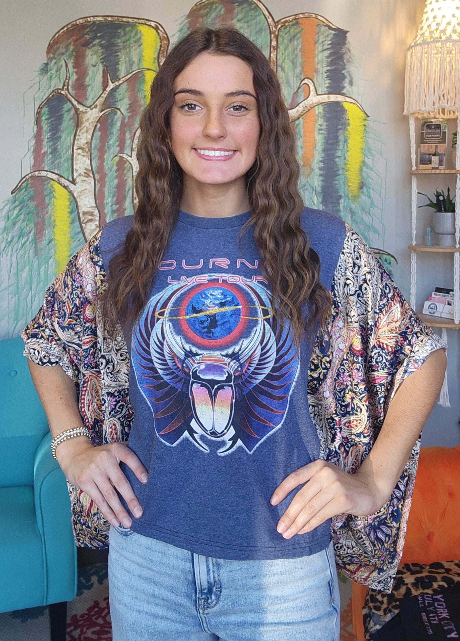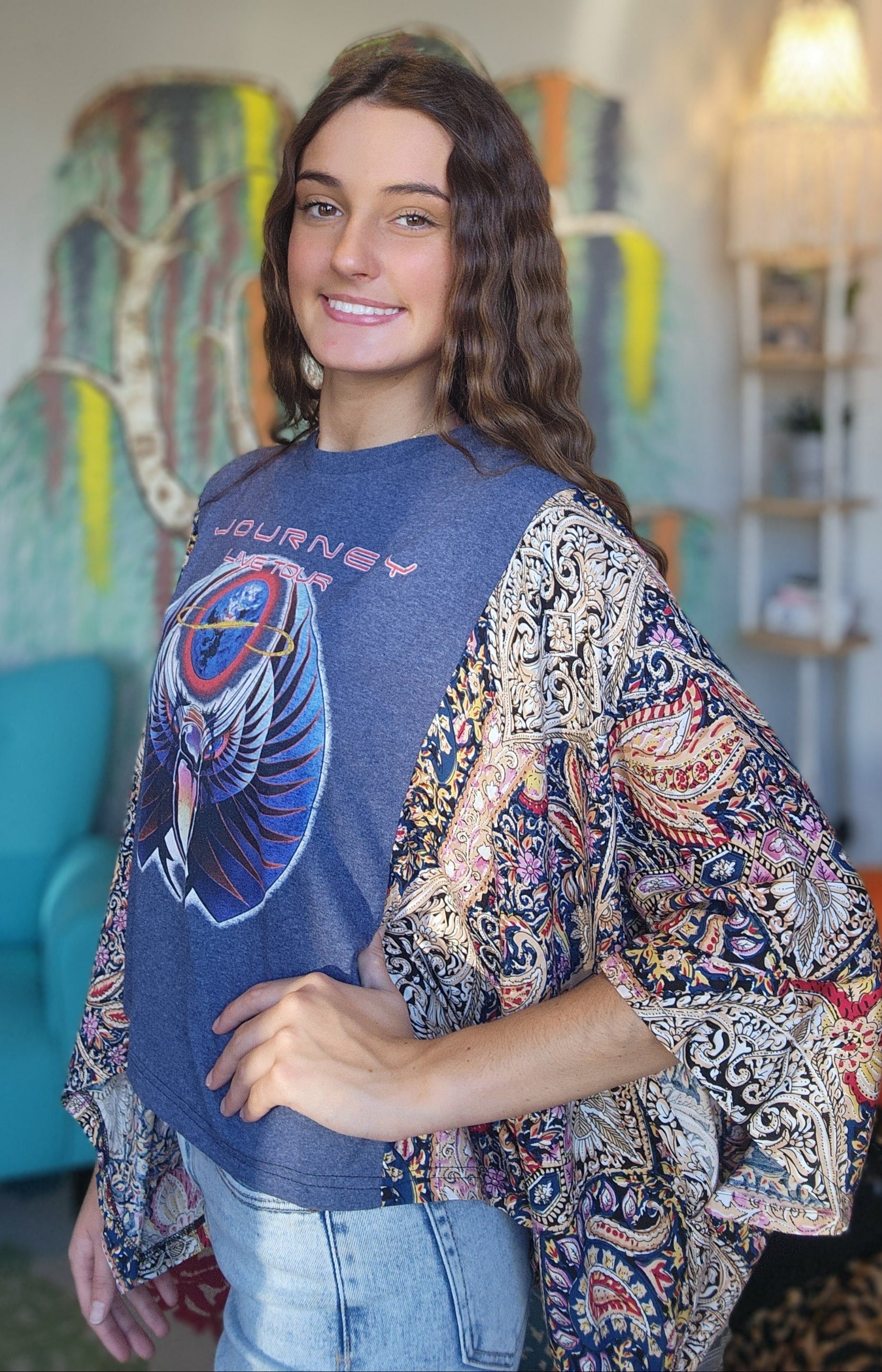 These pieces have been made using upcycled Rock band tees, each piece is one-of-a-kind and designed combining deconstructed vintage denim and upcycled band tees. This diverts it from the landfills and gives it new life.