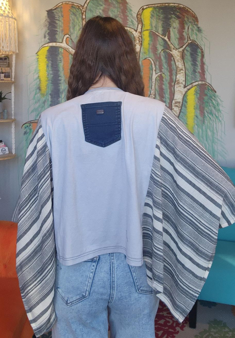 These pieces have been made using upcycled Rock band tees, each piece is one-of-a-kind and designed combining deconstructed vintage denim and upcycled band tees. This diverts it from the landfills and gives it new life.