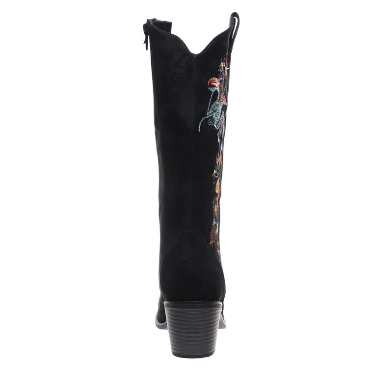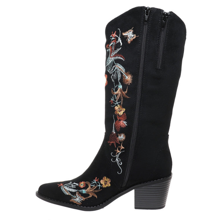 Wrapped in plush suede with embroidered florals, these high boots deliver both texture and visual interest. The deep, saturated colors of the fabric create an instantly sophisticated look, while strategically placed zippers at the side and calf offer practical ease. Perfect for those who want their footwear to reflect their individual style without sacrificing comfort or wearability.