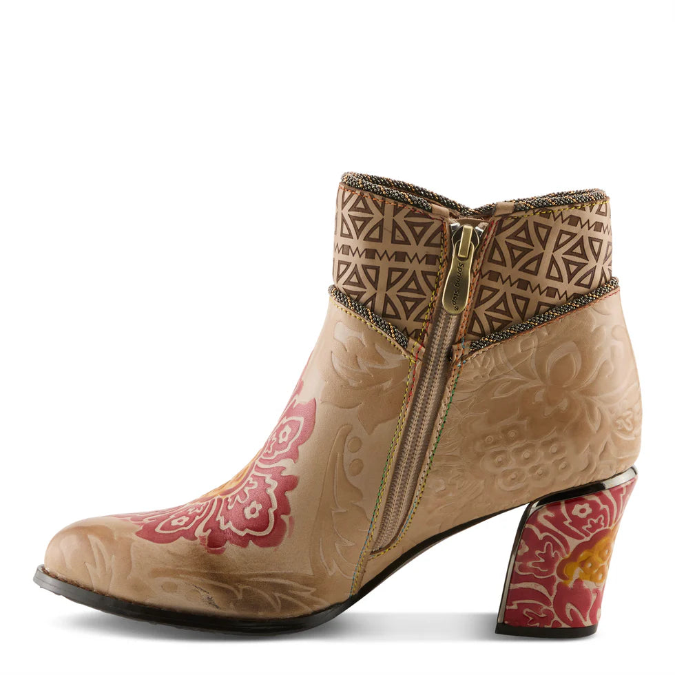Unleash your inner artist with this exquisitely crafted ankle boot, a stunning fusion of modern inspiration and timeless craftsmanship. Featuring a premium leather upper adorned with intricate embossed floral detailing and geometric patterns, this boot is a wearable masterpiece. A sculpted mid-heel adds a touch of sophistication, while the cushioned insole ensures all-day comfort. The inside zip allows for effortless wear, making it as practical as it is stylish. Whether you're dressing up or adding a unique twist to casual wear, this boot is a statement piece for those who dare to stand out.