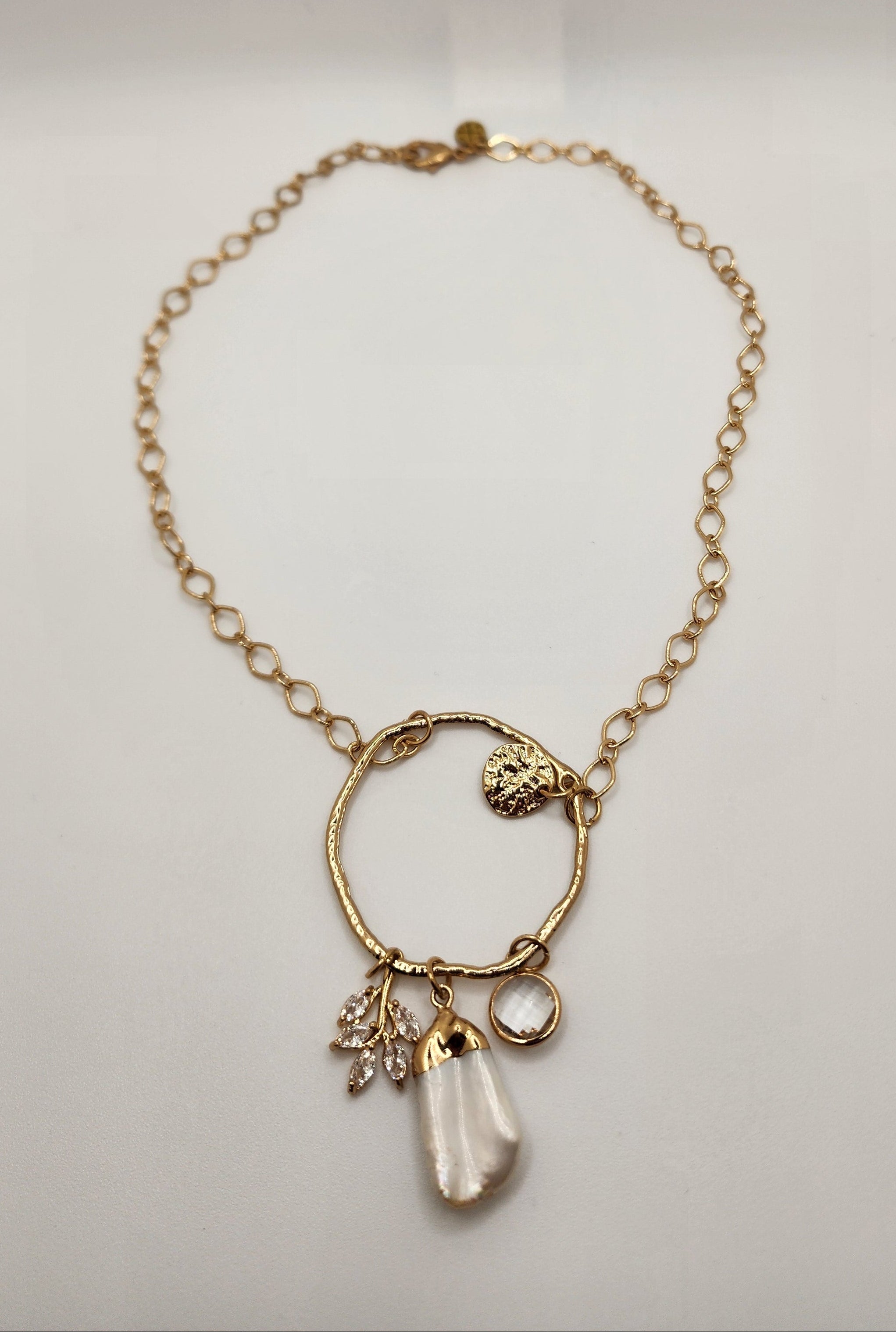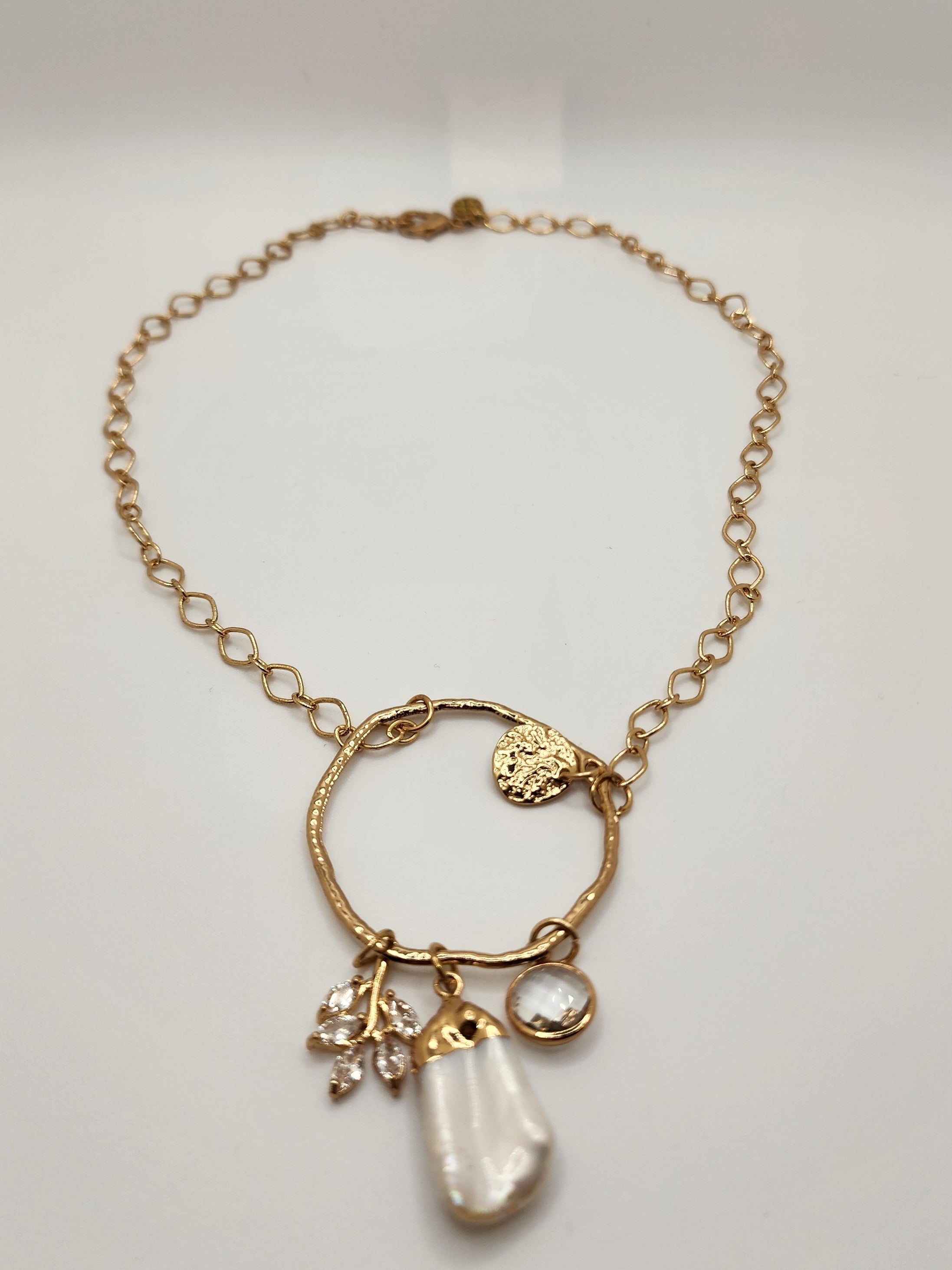 Gold circle charms suspended on a fine chain. Clean, understated design. Wear alone or layer with other pieces. Versatile enough for any occasion.